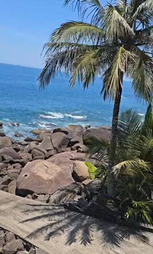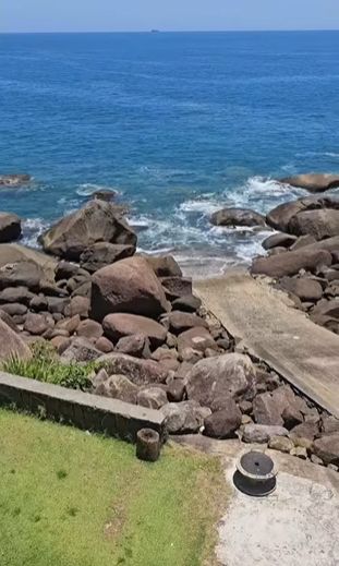 Na área externa, o imóvel dispõe de piscina, quiosque completo, gramado na costeira e rampa de acesso direto ao mar, um diferencial raro e extremamente valorizado em Ilhabela.