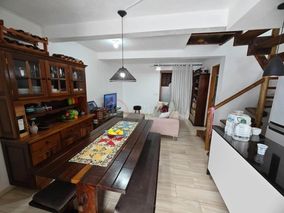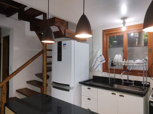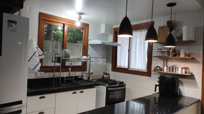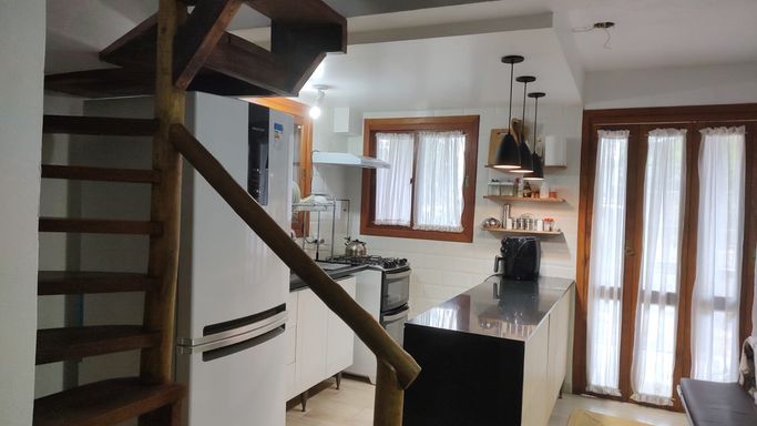 O imóvel possui 120 m² muito bem distribuídos, com 2 suítes no piso superior (ambas com ar-condicionado e mezanino em madeira cumaru), sala ampla com três ambientes integrada à cozinha em conceito aberto e balcão em granito, além de banheiro social no térreo.
