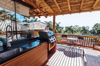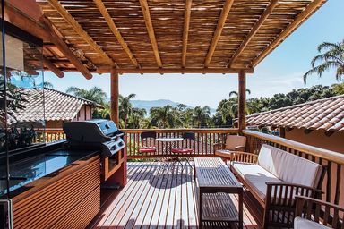 • Varanda Panorâmica: Deck de madeira com vista incrível para o mar, churrasqueira a gás Weber e móveis externos de design.